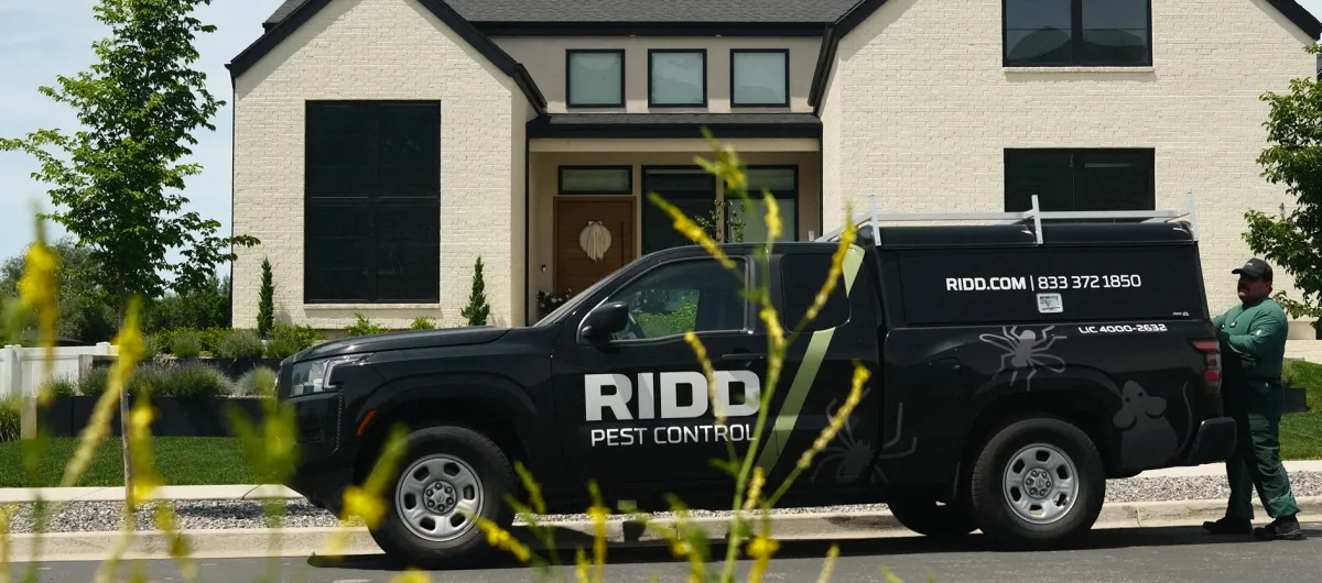 Black RIDDO Pest Control truck parked outside a modern suburban house with technician standing nearby.