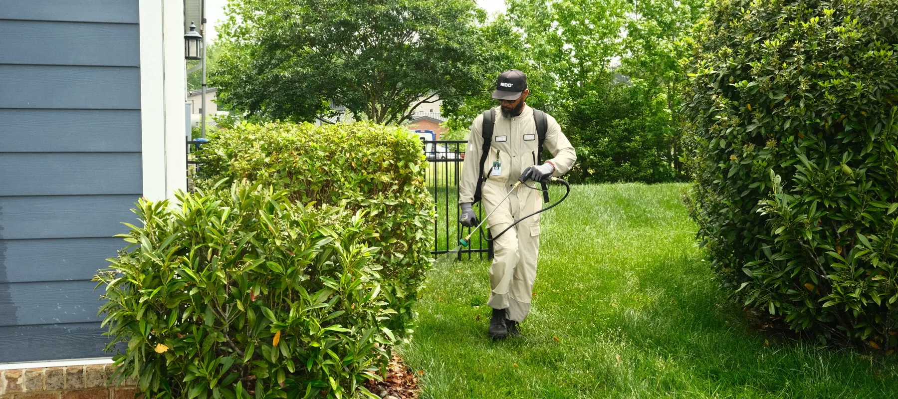 Professional pest control worker spraying insecticide on lawn and bushes in residential backyard